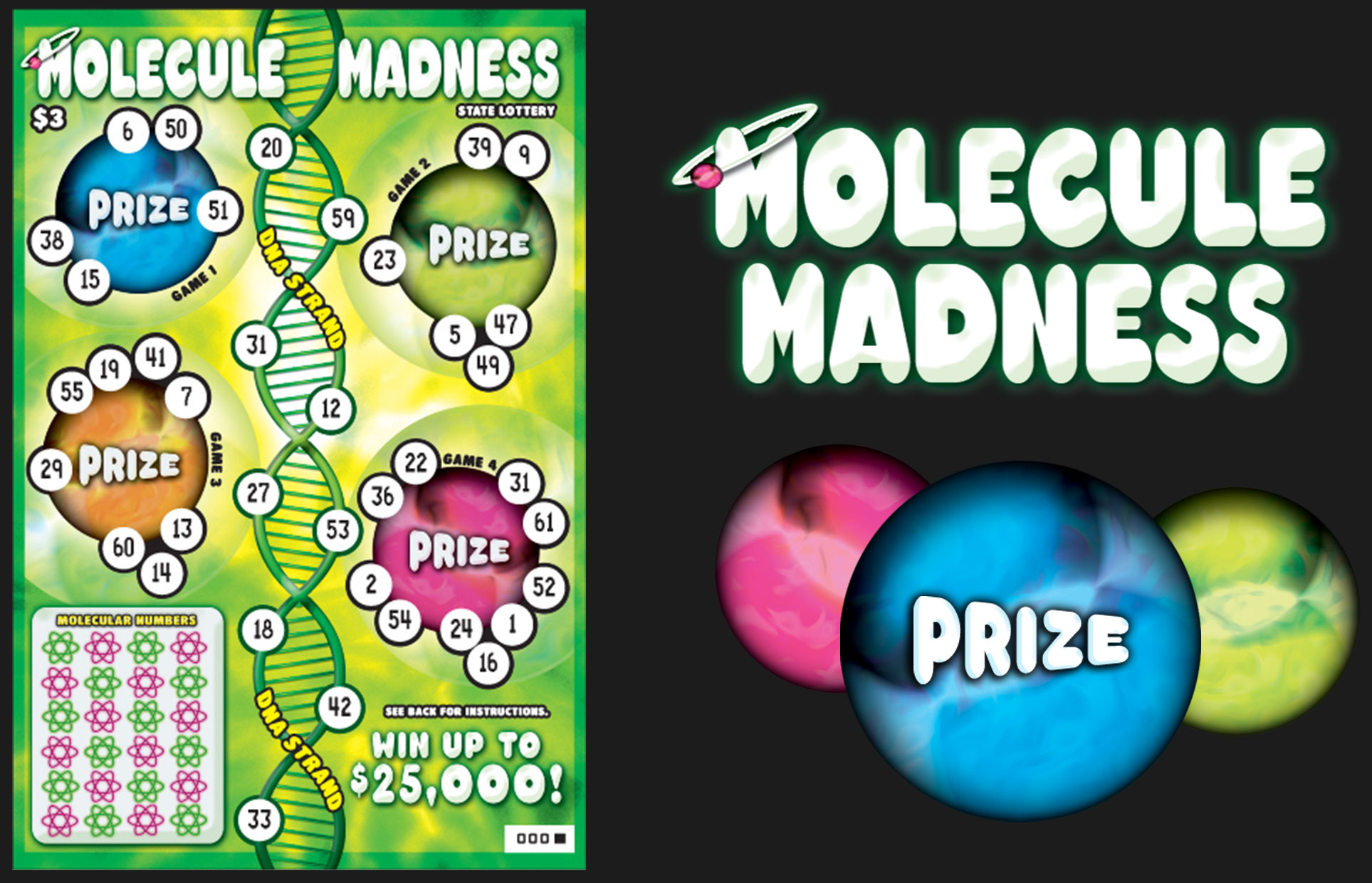 Concept Molecule Madness lottery ticket with space theme