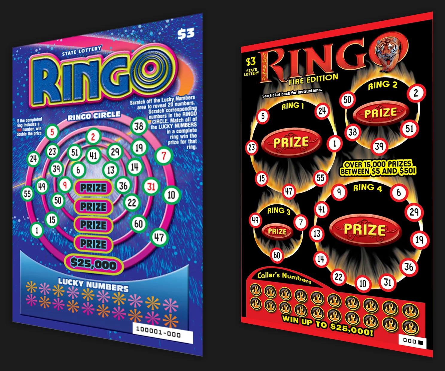 Concept bingo ticket created with space theme and fire theme. Ran for the Oregon and West Virginia Lottery.