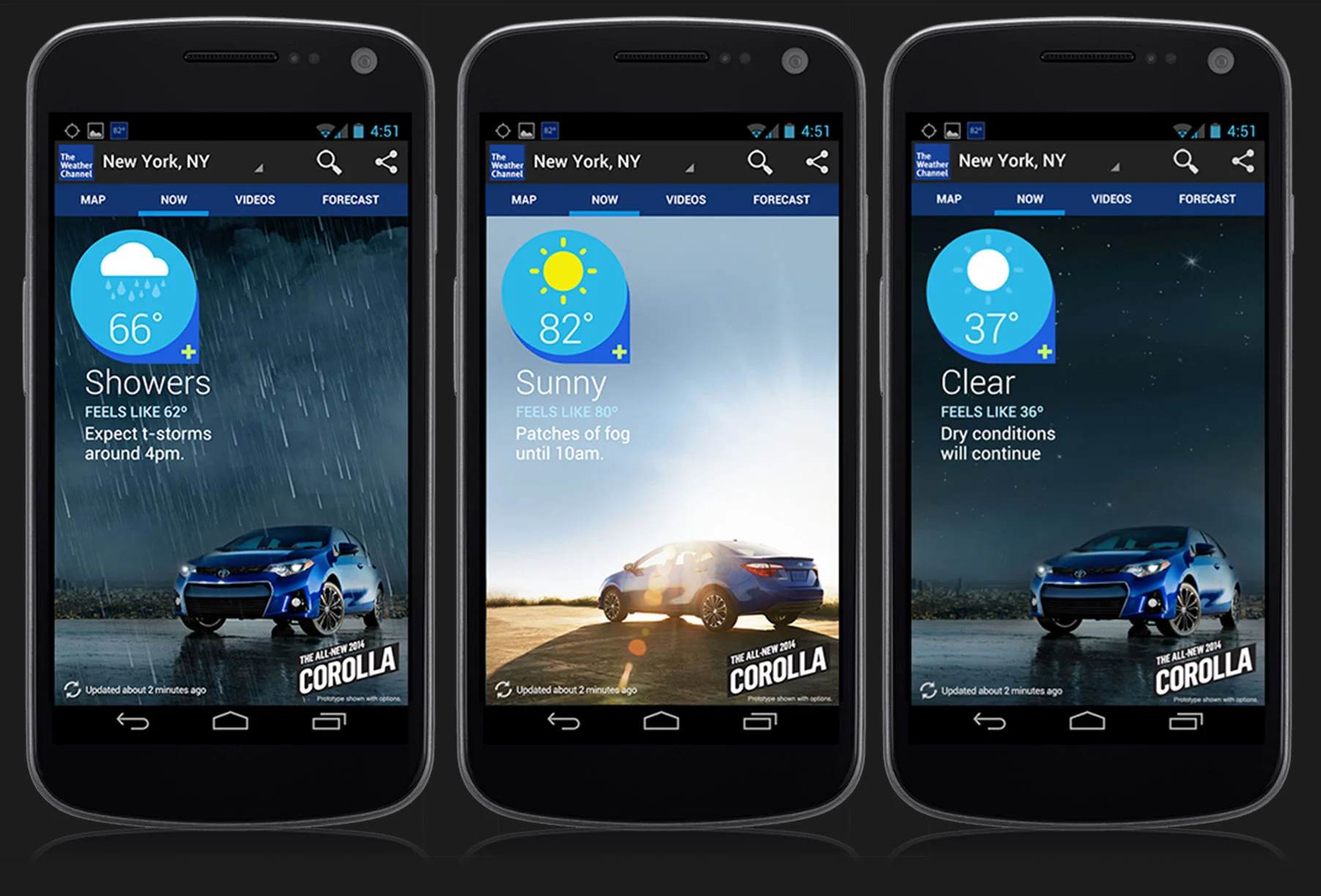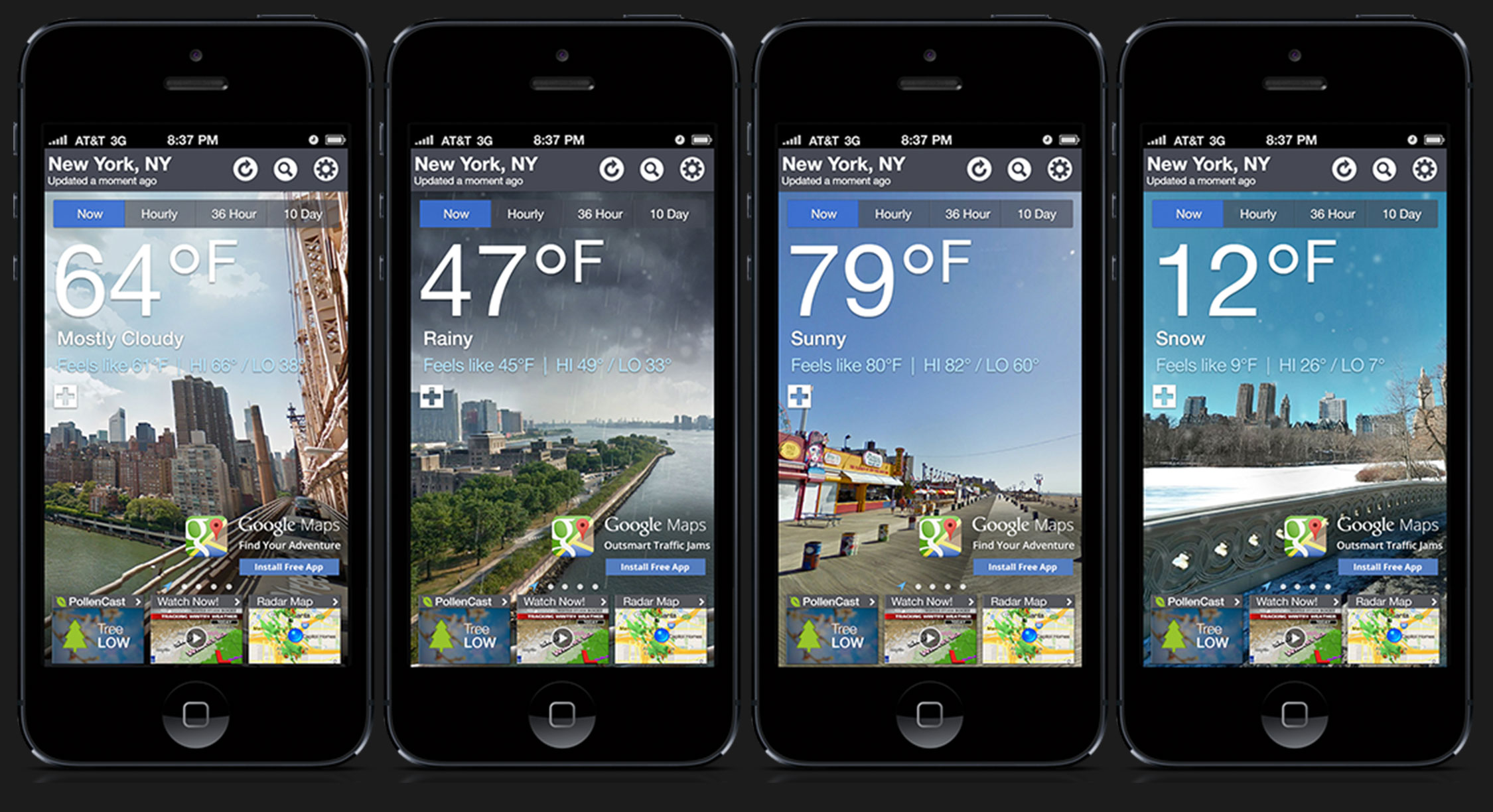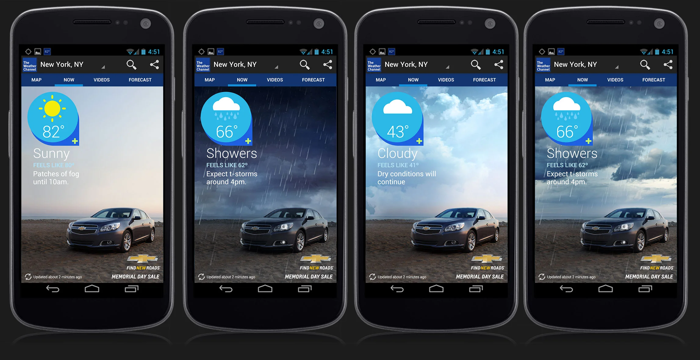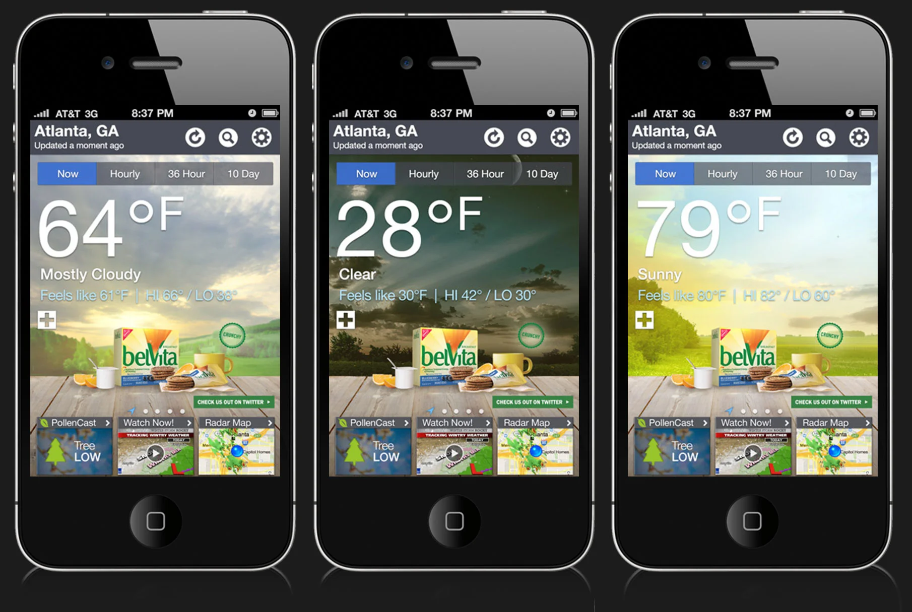 Branded Backgrounds are a product exclusive to The Weather Channel's that merges the advertiser content and the current weather conditions together in one custom creative. I helped to create the ad product and the extension across our digital and cable platforms. In my role, I defined the creative requirements and laid the foundation for design for this product. Here are a selection of those that have run so far.