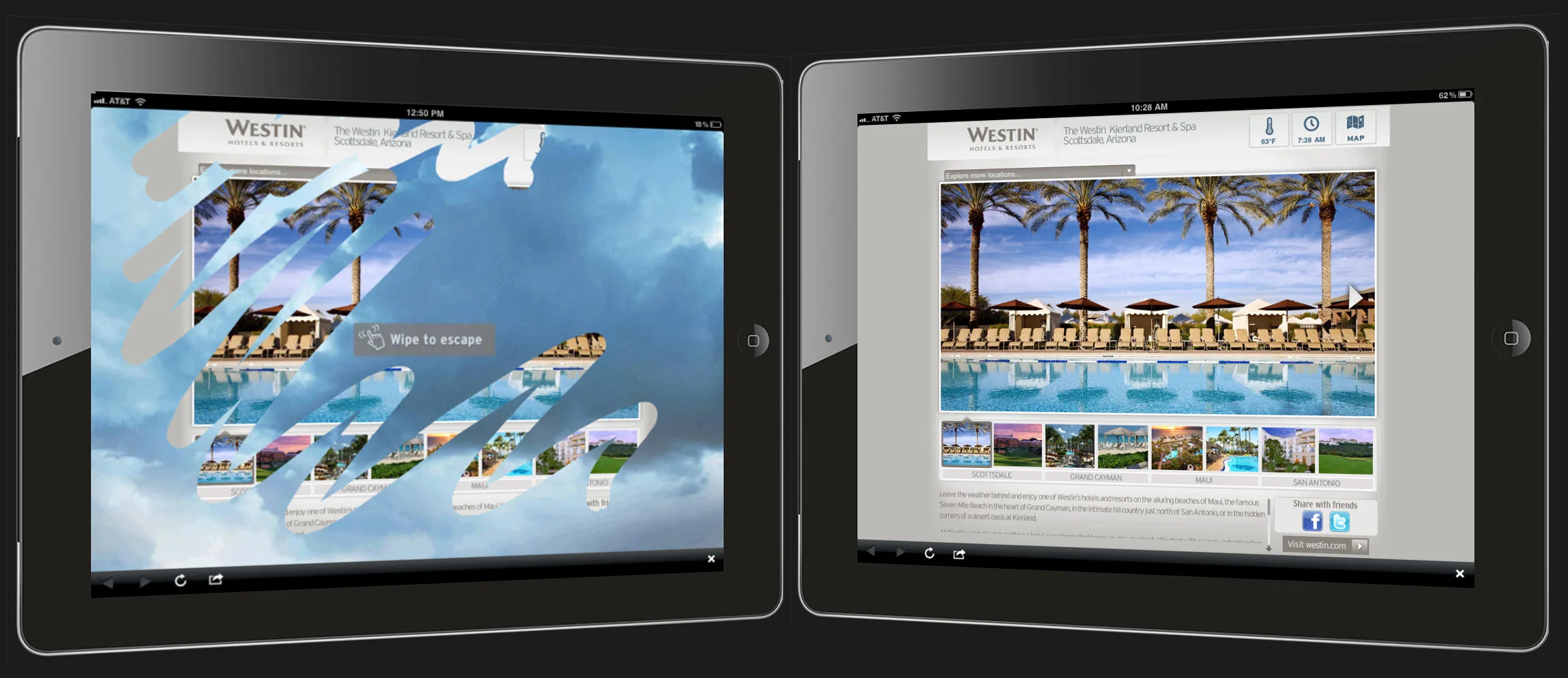 We worked with Starwood Westin's Hotels & Resorts to create a weather themed travel experience in our mobile and tablet applications. Ads pulled in a dynamic city name and aligned messaging with the weather condition. The banner expanded into a full screen weather visual which the user wipes away to escape into the Westin travel experience. Travel experienced highlighted specific resorts with photos, map and temperature.